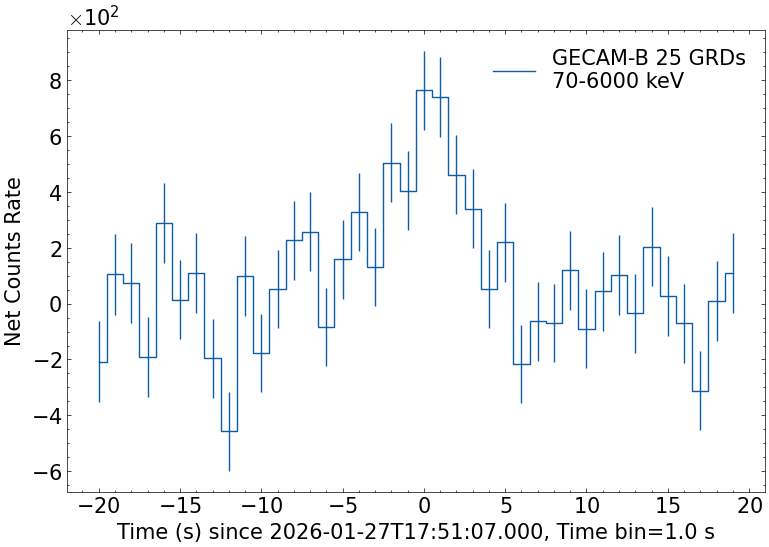 According to the GECAM-B light curves in about 70-6000 keV, this burst mainly consists of a pulse with a duration (T90) of 6 +1/-1 s.