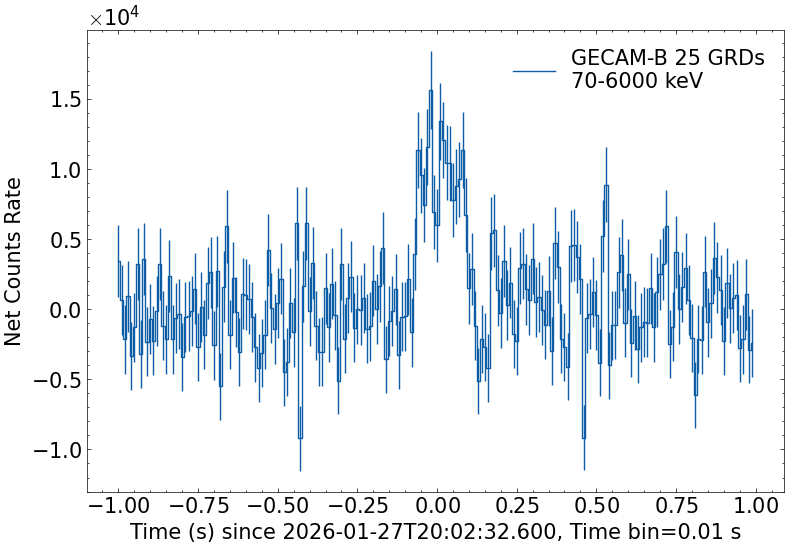 According to the GECAM-B light curves in about 70-6000 keV, this burst mainly consists of multiple pulses with a duration (T90) of 0.13 +0.11/-0.02 s.