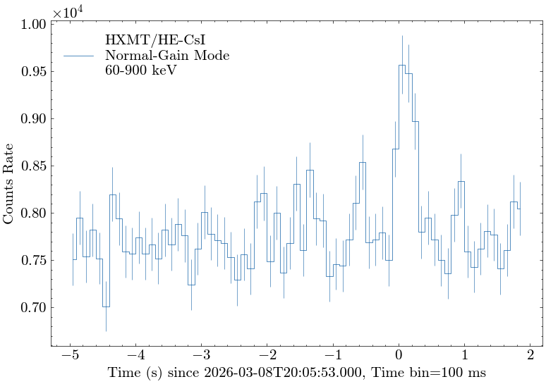 All measurements above are made with the CsI detectors of Insight-HXMT/HE operating in the regular mode with the energy range of about 60-900 keV (deposited energy). Only gamma-rays with energy greater than about 200 keV can penetrate the spacecraft and leave signals in the CsI detectors installed inside of the telescope.