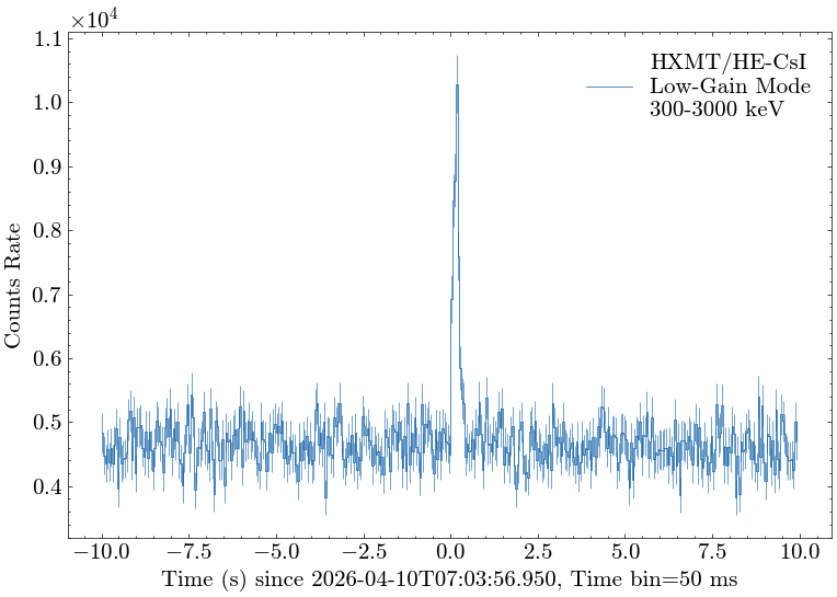 All measurements above are made with the CsI detectors of Insight-HXMT/HE operating in the low gain mode with the energy range of about 300-3000 keV (deposited energy). Only gamma-rays with energy greater than about 200 keV can penetrate the spacecraft and leave signals in the CsI detectors installed inside of the telescope.