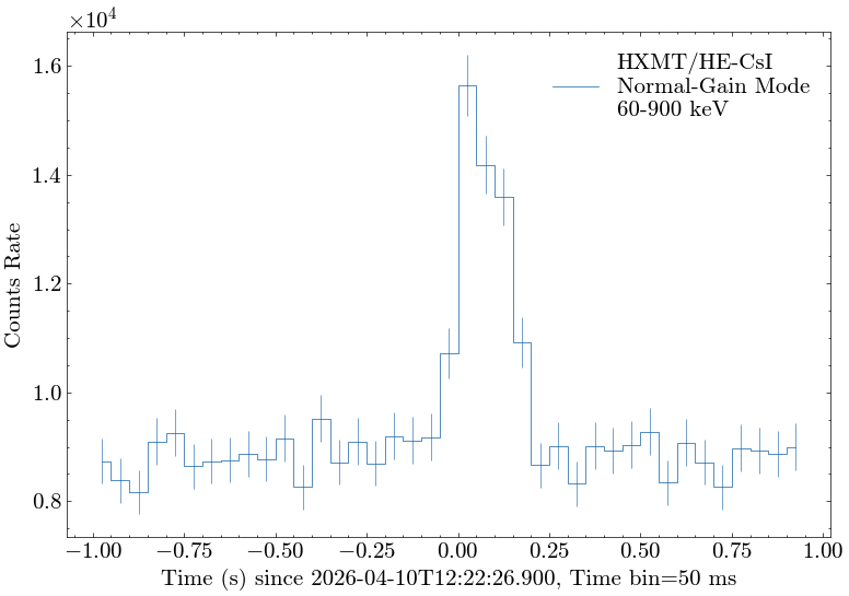 All measurements above are made with the CsI detectors of Insight-HXMT/HE operating in the regular mode with the energy range of about 60-900 keV (deposited energy). Only gamma-rays with energy greater than about 200 keV can penetrate the spacecraft and leave signals in the CsI detectors installed inside of the telescope.