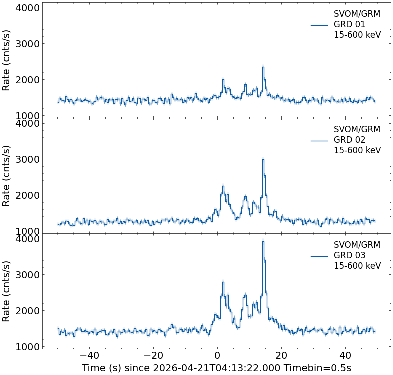 With the event-by-event data downloaded through the X-band ground station, the GRM light curve shows that this burst consists of multiple pulses with a T90 of 21.5 +3.5/-2.5 s in the 15-5000 keV band.