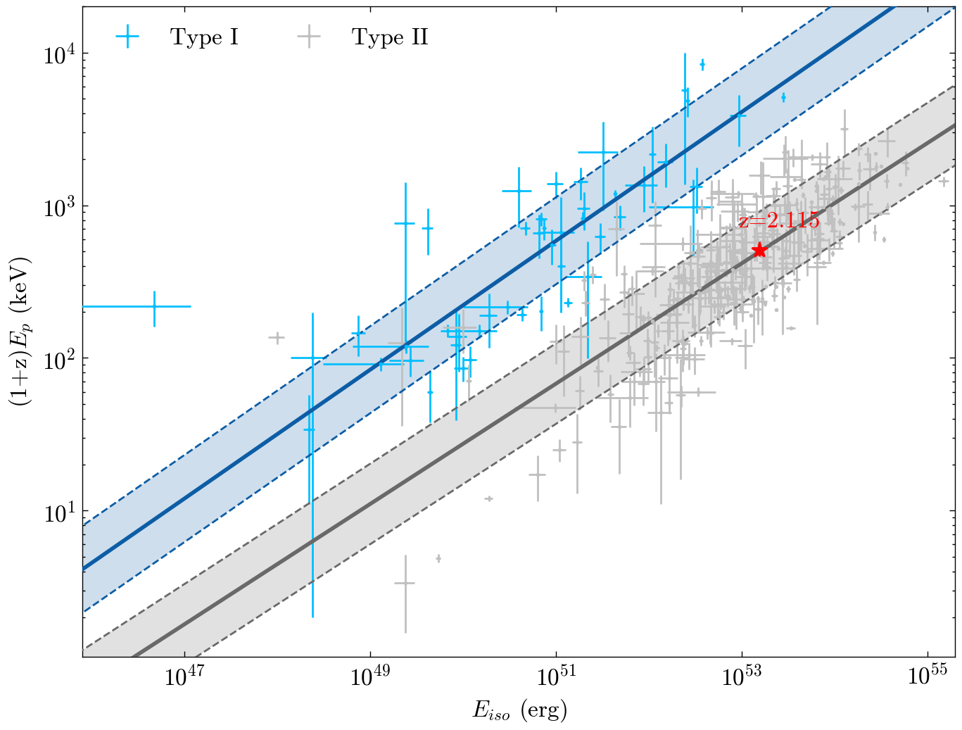 With the measured redshift z=2.115 (B. Schneider et al., GCN 44368), we calculate the isotropic energy Eiso is about 1.5E53 erg. Thus GRB 260421B is well consistent with Type II GRBs in the 'Amati' relation diagram, as shown at: