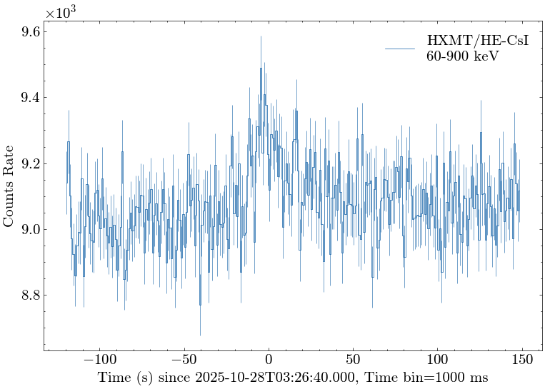 All measurements above are made with the CsI detectors of Insight-HXMT/HE operating in the regular mode with the energy range of about 60-900 keV (deposited energy). Only gamma-rays with energy greater than about 200 keV can penetrate the spacecraft and leave signals in the CsI detectors installed inside of the telescope.