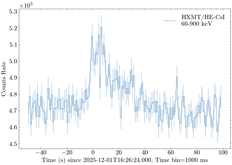 All measurements above are made with the CsI detectors of Insight-HXMT/HE operating in the regular mode with the energy range of about 60-900 keV (deposited energy). Only gamma-rays with energy greater than about 200 keV can penetrate the spacecraft and leave signals in the CsI detectors installed inside of the telescope.