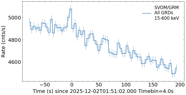With the event-by-event data downloaded through the X-band ground station, the GRM light curve shows that this burst consists of a single pulse with a T90 of 16 +8/-4 s in the 15-5000 keV band.