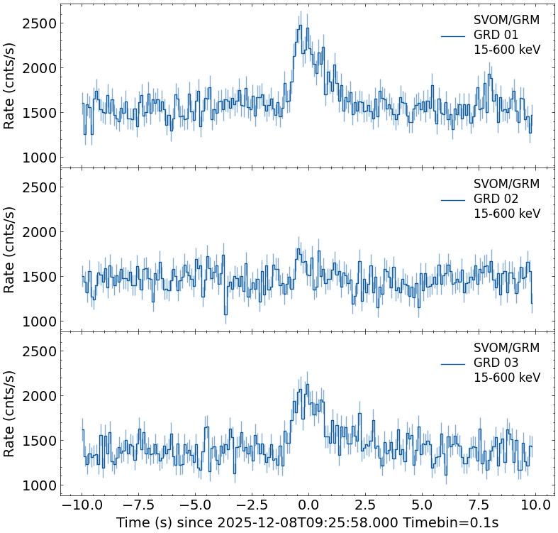 Using an adaptive window with a resolution of 32-ms, the burst onset is determined to be 2025-12-08 09:25:56.376 with a duration of 2.05 s and a total significance of about 13.5 sigma. The light curve comprises a single peak.