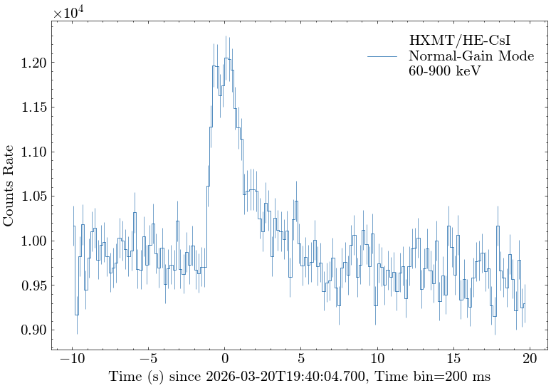 All measurements above are made with the CsI detectors of Insight-HXMT/HE operating in the regular mode with the energy range of about 60-900 keV (deposited energy). Only gamma-rays with energy greater than about 200 keV can penetrate the spacecraft and leave signals in the CsI detectors installed inside of the telescope.